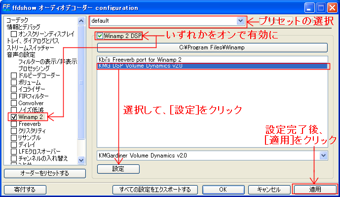 基本的には、ffdshowのフィルタを使うと同じ手順です。ffdshowのAudio decoder configurationのWinamp DSPで設定を行い、そのプリセットをffdshowフィルタで読み込みます。
