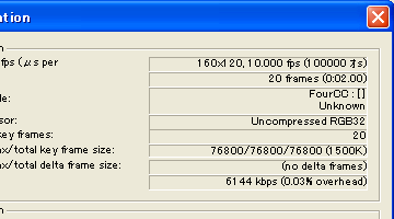 - スクリーンショット(VirtualDubModのファイル情報) 10fps、RGB32になっている。