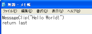 ここでは、MessageClipというフィルタを使いますので、「フィルタ名」の部分にMessageClipをあてはめます。また、「Hello World!」というテキストを表示させたいので、「パラメータ」の部分に"Hello World!"を記述します。文字列は、引用符で囲む形で記述します。