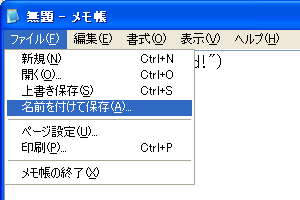 メモ帳のメニューから[ファイル] -> [名前を付けて保存]を選択します。