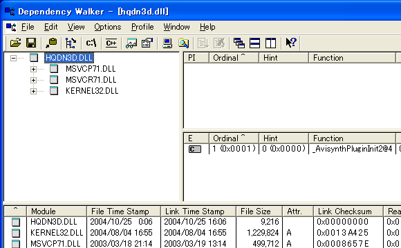 hqdn3d.dllをDependency Walkerで開いたところ。msvcp71.dllとmsvcr71.dllが必要であることがわかる。
