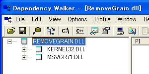 RemoveGrain.dll(動的リンク)をDependency Walkerで開いたところ。msvcr71.dllが必要となる。