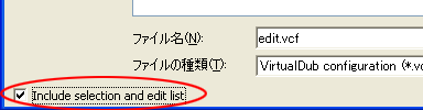 VirtualDub1.5.8/VirtualDubMod1.5.10.1以降の場合、vcfファイルの保存ダイアログ画面左下にあるチェックボックス([Include selection and edit list])を有効にした状態で保存してください。