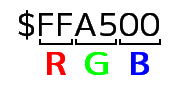 上 2 桁に R の値、真ん中の 2 桁に G の値、下 2 桁に B の値を、それぞれ 16 進数で指定します。上の例($FFA500)は (R, G, B) = (FF, A5, 00) で、それぞれ 10 進数に変換すると (R, G, B) = (255, 165, 0) になります 。