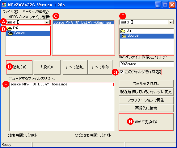(F)でWAVEファイルの出力フォルダを指定します。指定方法は入力フォルダの場合と同じです。出力フォルダを登録しておきたい場合は、(G)の「このフォルダを保存」にチェックしてください。