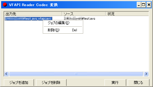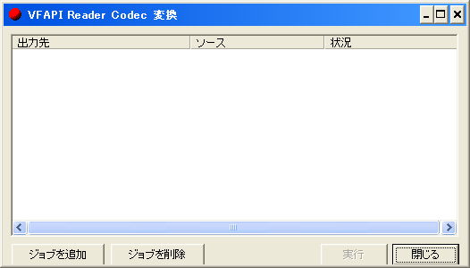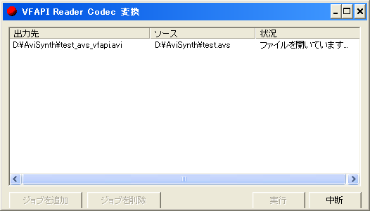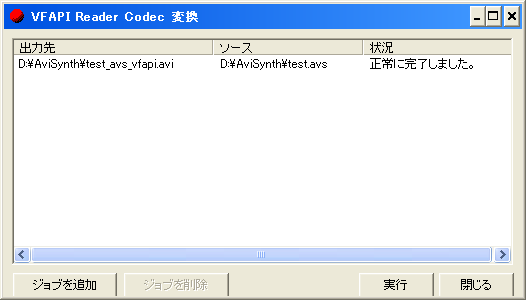 ジョブは複数登録することが可能です。VFAPI Reader Codec形式に変換したいAVSファイルをすべて登録し終わったら、「実行」をクリックします。