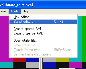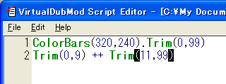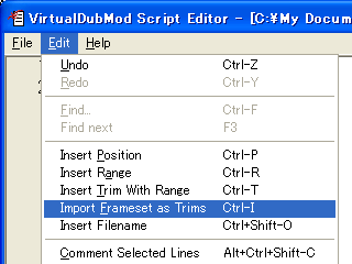 VirtualDubMod上で行った編集内容(選択範囲)を、同ソフト内蔵のスクリプトエディタに、Trimフィルタのフォーマットでインポートすることができます。