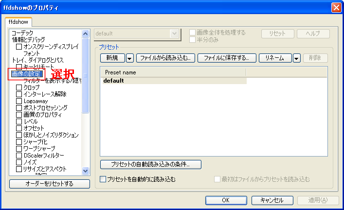 まず最初に、ffdshowの設定画面で、プリセットを作成します。