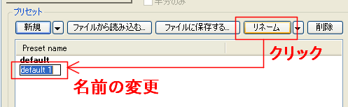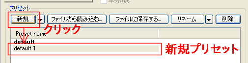 [新規](New)をクリックすると、[Preset name]欄に[default *](*は数字)という名前のプリセット追加されます。