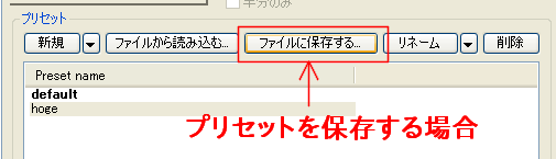プリセットを保存したい場合は、プリセット名を選択した状態で[ファイルに保存する...](Save to file...)をクリックし、適当な名前を付けて保存します。