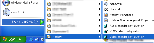 [スタート]メニュー -> [ffdshow] -> [Video decoder configuration]をクリックして、ffdshowのビデオデコード設定画面を起動します。音声フィルタを使用したい場合は、[Audio decoder configuration]から設定を行ってください。