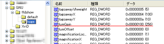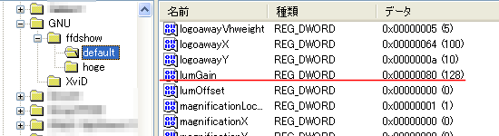 上の2つを比較すると、lumGainの値が異なっています。デフォルトではlumGainの値は128、hogeでは256です。これらの値は、ffdshowの設定画面で行った変更と一致しています。