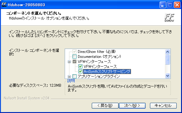 makeAVISをインストールするためには、ffdshowのインストール時に、「コンポーネントの選択(Choose Components)」で「AviSynthスクリプトサービング(AviSynth scripts serving)」にチェックを入れる必要があります。
